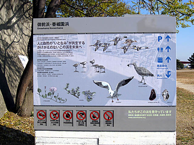 本日も安定した南風、でも強風の香櫨園浜でした。帰り際にソーラー電池を使った案内板がある事に気付き、初めて写真に撮りました、何と便所の案内までありますね、^_^;。今居る鳥は、カモ、カモメ、サギと種類が少なく、ここで越冬していくカモ、カモメがめっちゃ多く居ます。