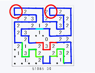 毎日一題づつのSlitherlinkですが、この問題には久しぶりに頭を使いました。何の気なしに、いい加減にトライしたところ、見事うまく行かず、間違いを見落としたり、品のない態度を反省し、先ず何にも考えずに決まる赤の部分を決め、ついでこれも赤の部分に依存して自動的に決まる緑の部分を決め、縦の”1”をどう通過するかを決心し、空色の様に仮に決め、後は自然に決まって来ました。最後に、赤丸の部分を微調整し、完成しました!出来てよかった、^_^;。